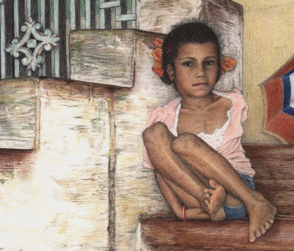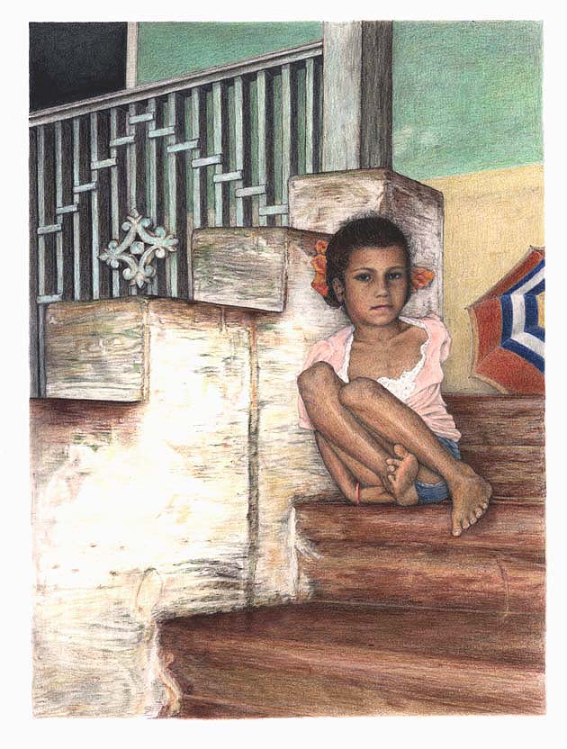 Girl in Pink, GoaThis youngster lived in the same small Goan town. Lots of the children spent their days selling fruit and soda on the beach to help support their families. Not this little girl, though. She was fortunate enough to go to school every day. The original drawing is on 11" x 14" bristol board with the image size 8" x 10 3/4". The prints of this drawing are slightly larger, actual size 11" x 14" with the image size 8 3/4" x 11 3/4", produced in an edition of 95. The cost of each print is $75. |