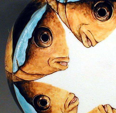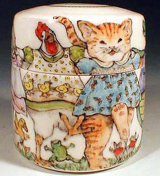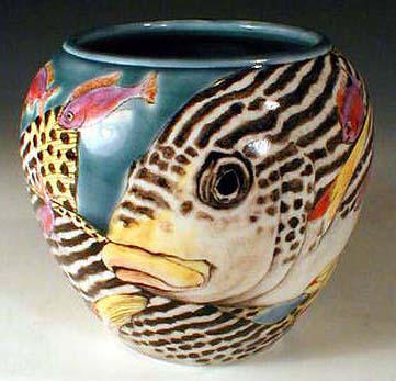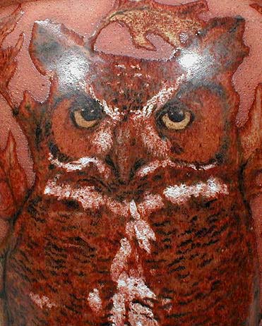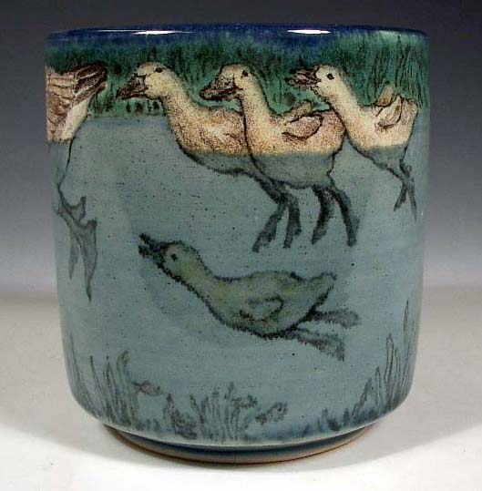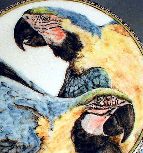 Porcelain is a manufactured clay, never found in nature. It is extremely smooth, more difficult to throw, and can have a tendency to slump. Porcelain dries differently than other clays, going from wet to dry in a moment in time rather than gradually. The surface can be suddenly dry when the interior is still damp. This can lead to cracking as well as problems when attaching handles. I use white stoneware when I want a white background and am adding a handle, otherwise I prefer porcelain. There are some good white stonewares but the surface is inevitably rougher. Despite the problems, porcelain has no equal in providing a white background and a paper-smooth surface. Colors on porcelain can be intensely vivid, and the smooth surface allows me to add maximum detail, providing a tightness and sharpness, not attainable on stoneware clay surfaces. |