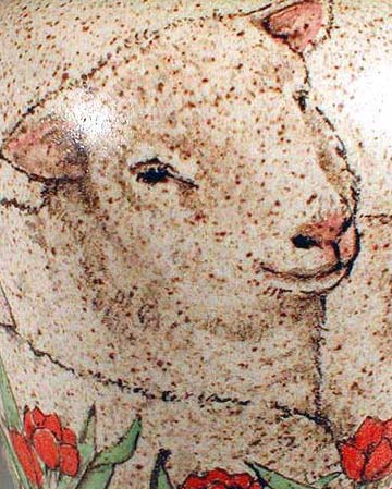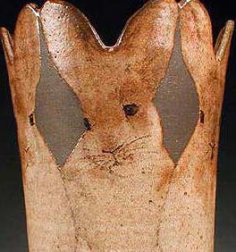 Working with more deeply colored clay allows you to use the clay as part of the design. White or very light clay gets dirty with use so it is usually covered with a glaze to protect the clay. With a darker clay, it's viable to leave it unglazed, giving a direct connection to the clay. Also, there is an interesting contrast between the smoothness of the glaze and the rougher surface of the clay. The pots above are made with two different red stonewares and one black stoneware. The black looks grey due to the studio lights. The challenge of using colored clay is that the glazes are strongly influenced by iron and other colorants in the clay. The glaze on the wild sheep pot (red clay) is the same as the glaze on the rabbit pot (black clay). You can see how the white glaze becomes tan on the dark clay. |