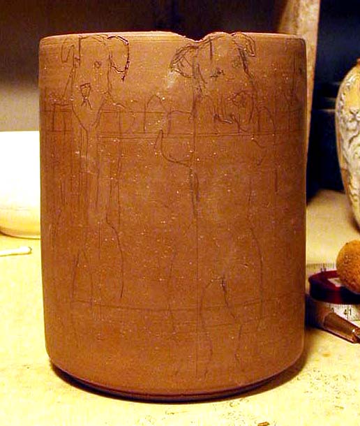 First, I threw straight-sided shape of light brown stoneware on a potter's wheel. The next day when the pot was partially dry, I trimmed the pot to make the foot on the bottom. After trimming, I lightly drew a standing Airedale on pot with a pencil to get a sense of spacing and how many Airedales would fit comfortably around the pot. I decided on seven, lightly marked seven segments on the pot, then drew in the Airedales. |