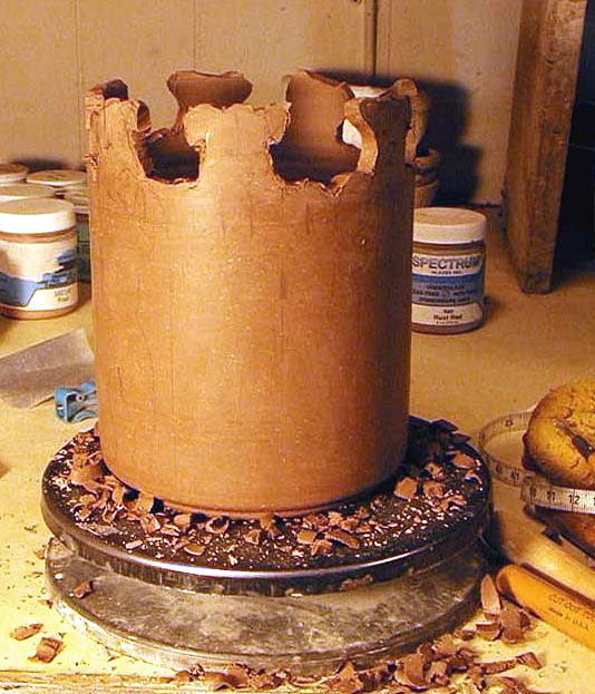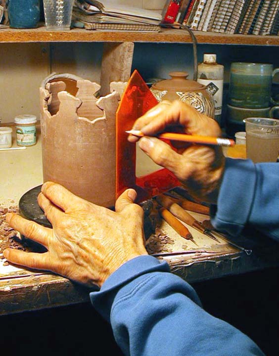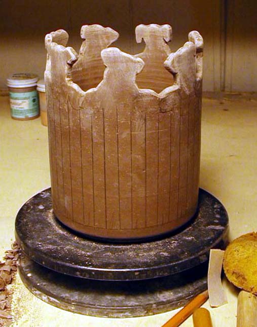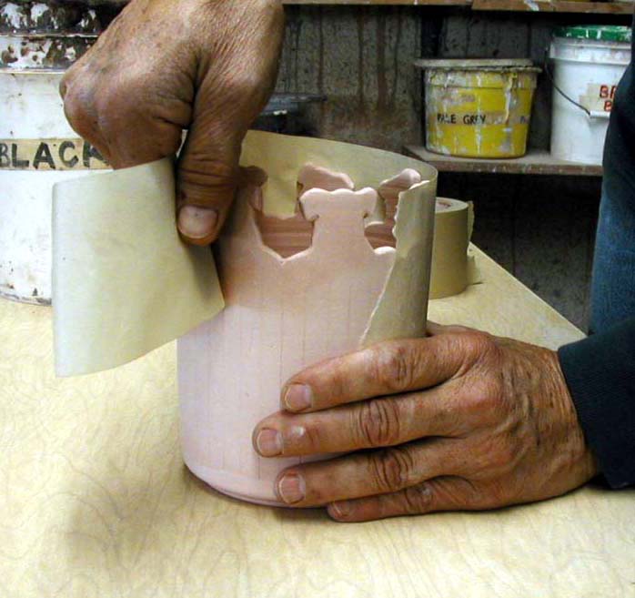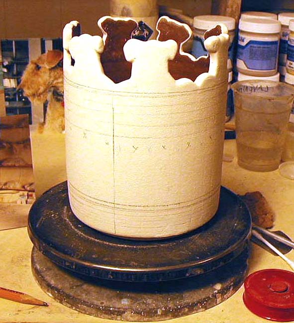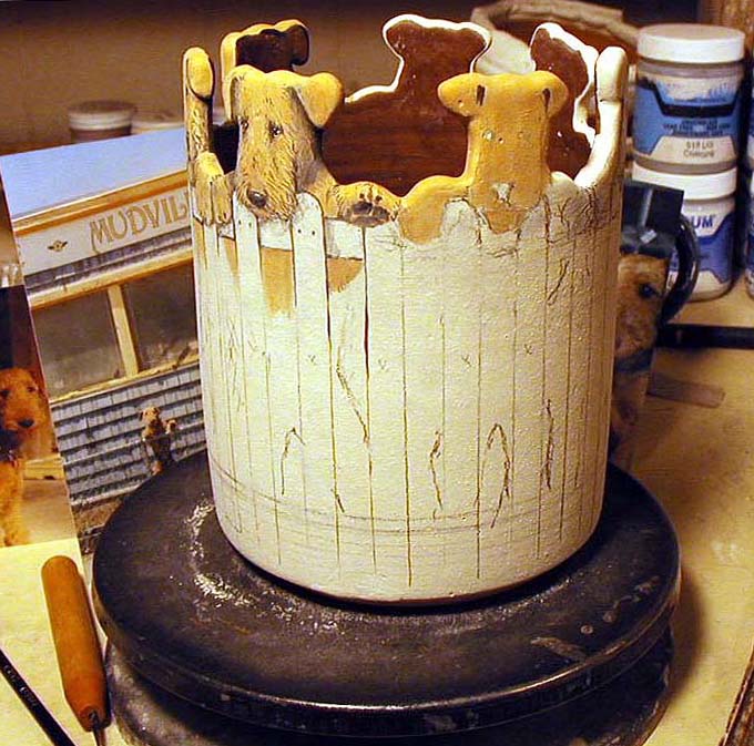 Working my way around the pot, I carefully cut around the Airedale heads and paws using sharp tools similar to Exacto knives. After the rough cut-outs were done, I cleaned up and beveled the edges along the rim so they wouldn't be sharp. For this, I used the knives, fine sandpaper and a slightly damp sponge. As the pot dries, it becomes more brittle so a gentle touch is needed to avoid breakage or cracks. |