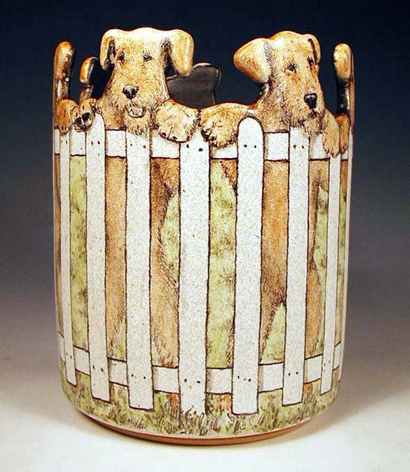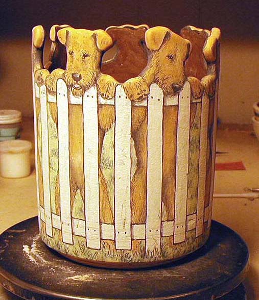 Once the design is worked out in pencil - details like where the fence posts will be as well as the positions of the Airedale heads - the pot is ready to be painted with underglazes. When the painting is finally done, the pot goes into the kiln for the glaze firing. Now's the time to hope for a good firing with no unwanted surprises! |