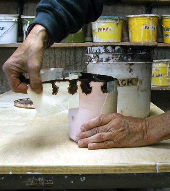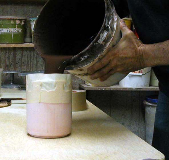 After the interior black glaze is poured out, the masking tape can be removed. To glaze the outside, I cover the black glaze with wax resist, and dip the pot in the white glaze top in first, holding onto the foot. |