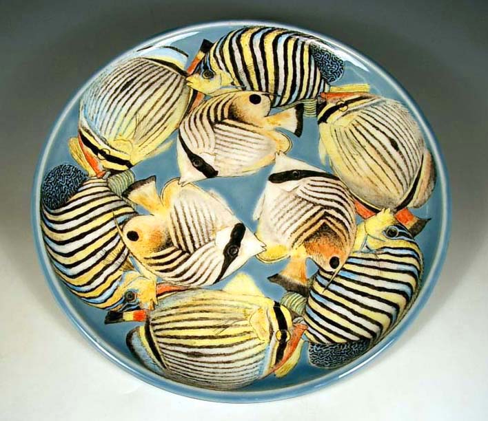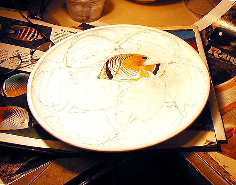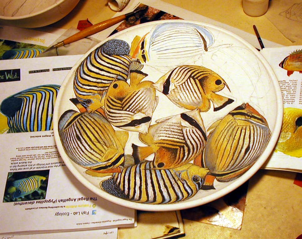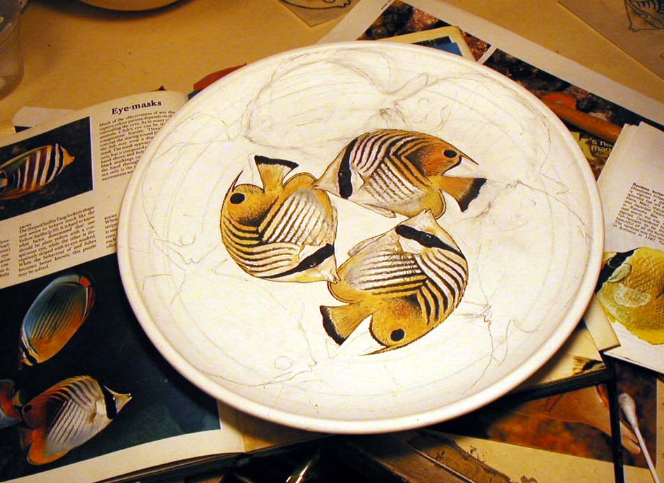 I wanted fish with stripes going in different directions so I searched my files until I found fish that seemed like they would go well together in both color and stripe pattern. I worked out the placement in pencil, drew the fish, then began to paint with underglazes. |