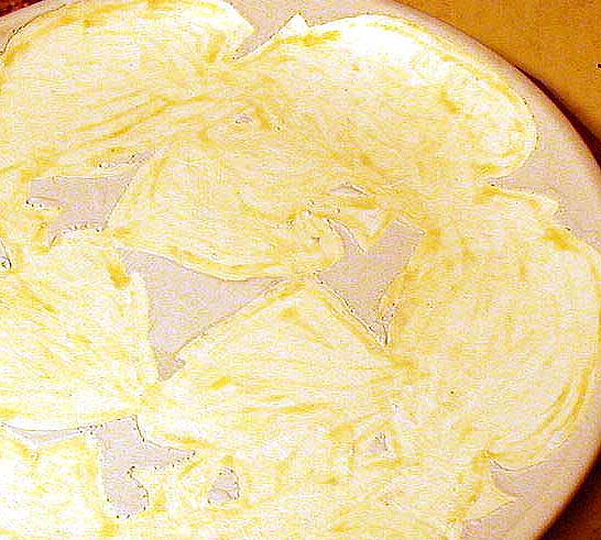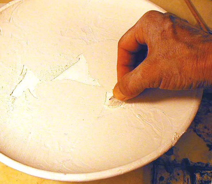 First, I threw a platter in porcelain on a potter's wheel. The next day when the pot was partially dry, drier than usual to prevent the flat part of the plate from collapsing, I trimmed the pot to make the foot on the bottom. The pot was bisque fired to cone 08. |