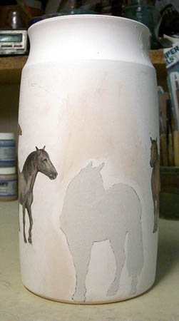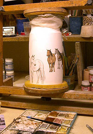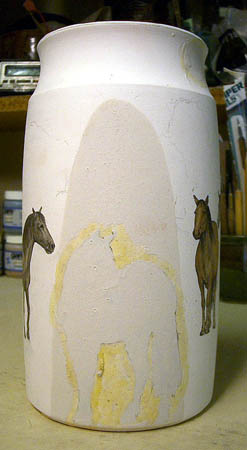 To get the clear glaze on the white horse, I painted latex resist around the edge of the horse so I would know where the borders were. The I held the pot sideways, and just touched the pot to the glaze surface. Then, I peeled away the latex and cleaned off the remaining transparent. |