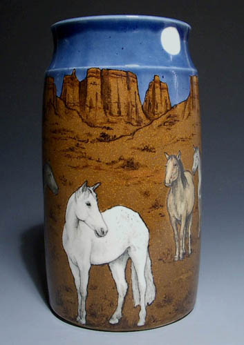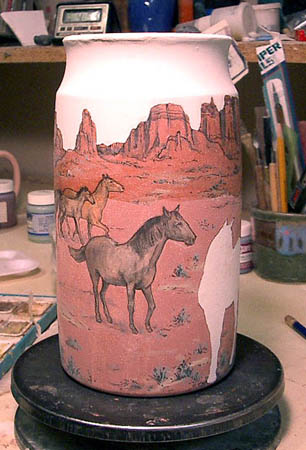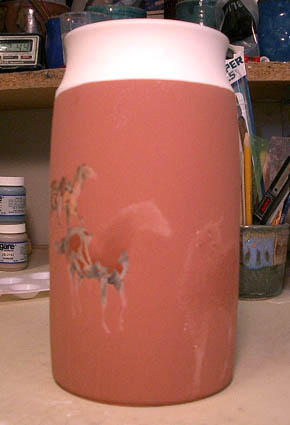 Next I put latex resist over the white horse and dipped the pot in brownstone, one of our studio glazes. You can see glaze beaded up on the wax over the horses. I used a little sponge and Q-tips to clean the glaze off the horses. I cut away the top edge of glaze to make the shapes of the mesas and cleaned away the extra brownstone there, too. Also, a circle of transparent was glazed where the moon would be, then that area was covered with latex. Finally I peeled the latex off the transparent glaze over the white horse.