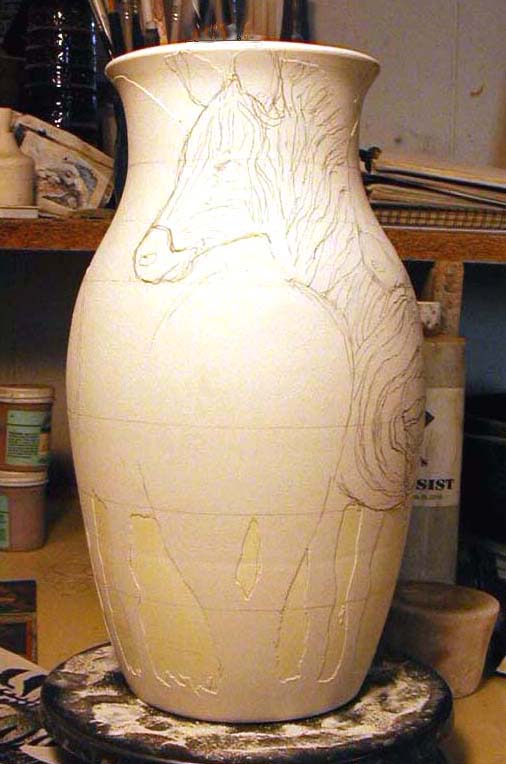 I glazed the inside of the pot with a black glaze then I did a rough drawing of the zebra on the pot to see how much space it took. I measured the design and the diameter of the pot to see how many animals would comfortably fit together; I decided on four zebras. Next I drew the zebra shape four times, fitting together the heads over the backs. When that was done, I painted liquid latex in the background areas. The pot was dipped in a white matte glaze and the liquid latex was removed from the pot. In this picture, you can see the white glaze standing out in relief on the pot's surface. |