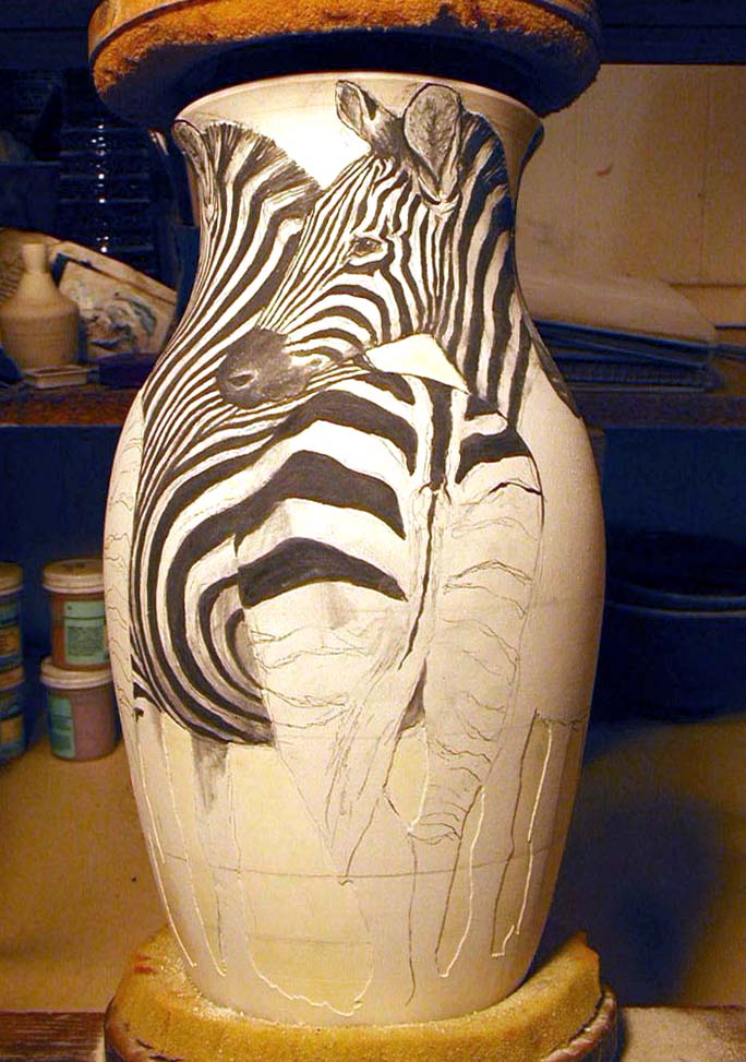 After zebras were drawn in pencil, I began to paint them with underglaze paints. I work in the top area first so I don't smudge the underglazes as my hand rests on the pot. After the underglazes were applied, I painted wax resist over the zebras and waited a day for it to harden. Then I dipped the pot in black glaze to fill in the background areas. I cleaned up any black glaze that stuck to the wax, then cleaned up the edge where the white and black glazes meet with a sharp stainless steel rib. This must be done carefully because if there is a glaze built-up at the meeting edges, the upper glaze will probably run down into the lower glaze. The pot was now ready to fire. |