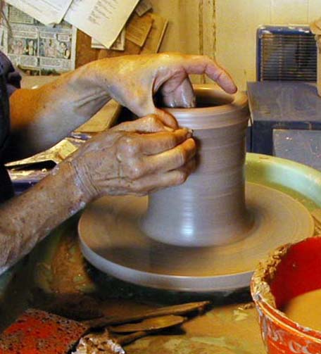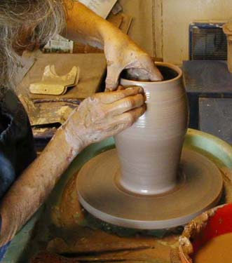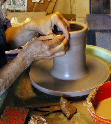 Here are few pictures of me working on the wheel, but really, if you want to learn to throw, find a friendly studio and take some lessons. Learning to throw is like learning a sport or to play a musical instrument. It takes a while to get coordinated, and lots of patience is needed. Like any physical activity, practice counts. The more time you spend at the wheel, the more your hands and brain begin to work together. |
