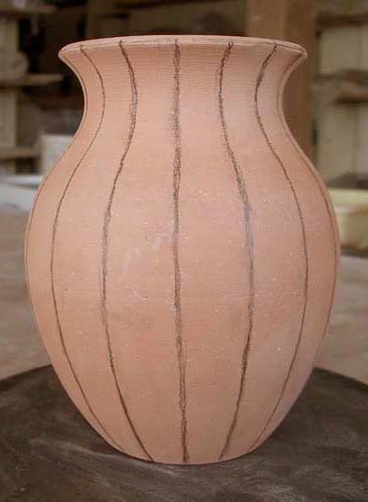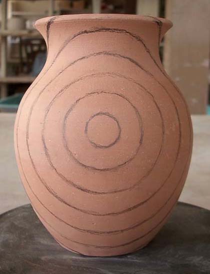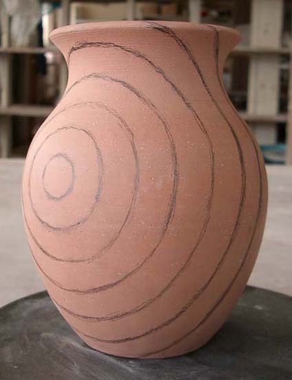 Symetrical pots thrown on a potter's wheel can expand out, like a bowl; have straight-sides like a pencil holder or a mug; or can expand and contract, like this vase. On this pot, straight lines have been drawn top to bottom. The distance between the lines contracts at the neck and the bottom and expands in the middle. When you look at this pot, the line directly in front of the viewer looks straight but every other line creates the illusion of being a curve. It would be difficult to draw a square on a shape like this. This flowing in and out of a line can work with the design or against it, emphasize the shape of the pot or alter it. |