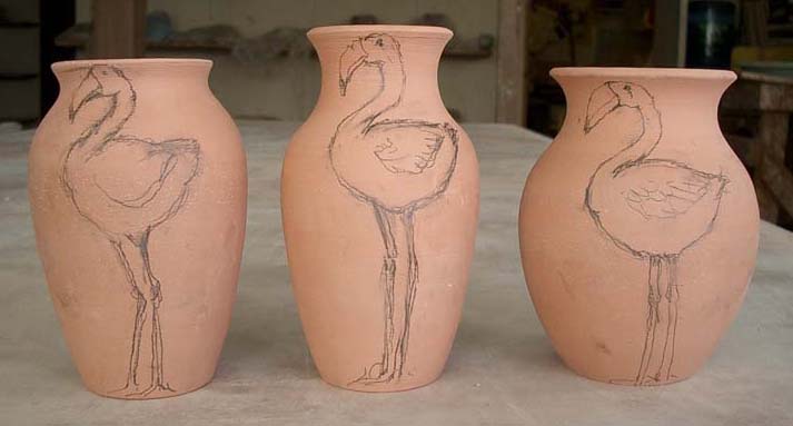 Here are three pots, each with a flamingo drawn on it. On the pot to the left, the neck of the flamingo must be shortened to get the body to fit the roundest part of the pot. On the pot on the right, the head of the flamingo is on the reverse curve of the rim causing distortion (it was the most awkward to draw). On the pot in the middle, the flamingo fits with a natural ease. |