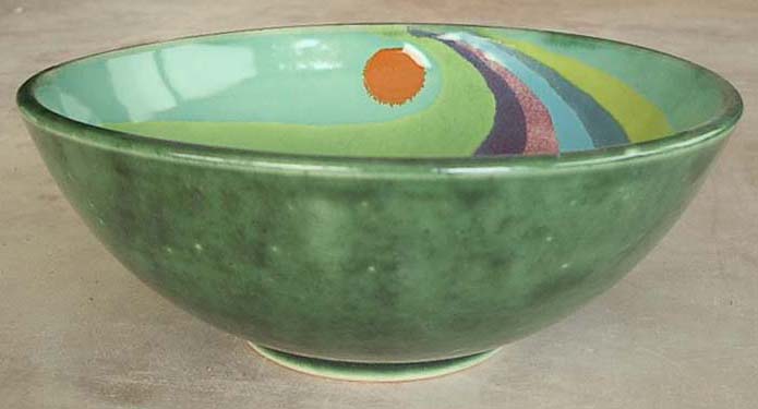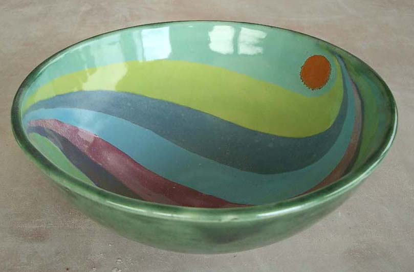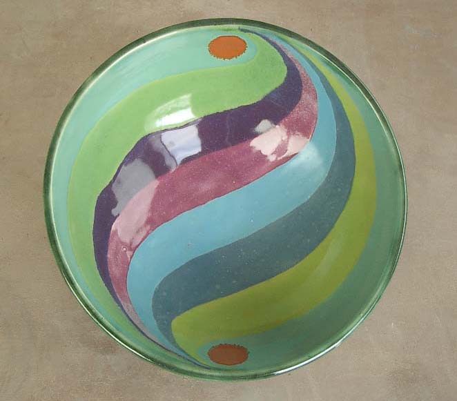 Designs on the interior of a bowl are at the mercy of the curve, closing in the center and opening out at the rim. The design on this bowl works around the problem with a simple reverse curve design that tightens at the rim and is open in the center. There is also the issue of the angle of sight, across the bowl or directly into the center, which changes the design radically from a tight cluster of colors to broad open bands. |