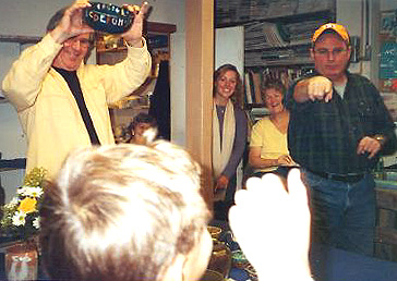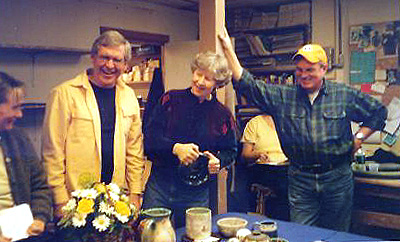 Here Paul's taking a bid from our youngest (and very competent!) bidder, then Lesley, Clayton, Nan and Paul have a laugh during a break in the action.At the end of the day, lots of people went home with their favorite pots and a good time was had by all. We hope to see you at the next show in 2006.Thanks for Lesley Mattuchio and Lynn Sweezy for taking pictures. |
