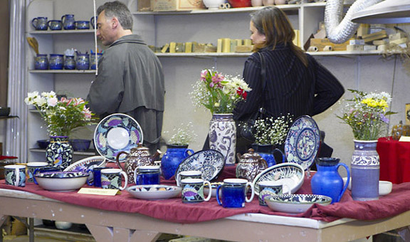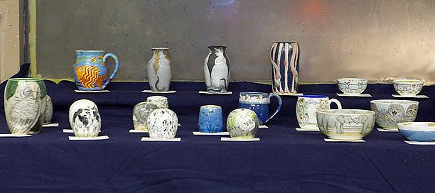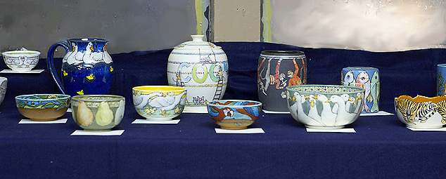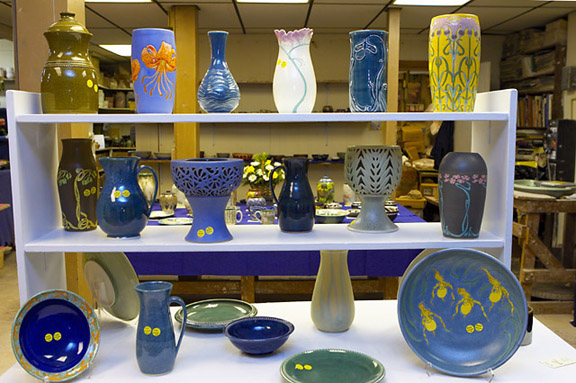 Every surface in the studio was covered with pots. There were well over 500 pots! The pots pictured here were done by Meryl Brenner. |