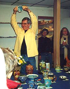 At 11:00 Saturday morning, the auction began. Paul Gibson, everybody's favorite auctioneer, swung into action as Nan's brother Clayton, here from Arizona for the show, displayed the pots. |