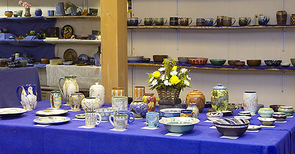 The weekend of December 10 -12, the 2004 Mudville Show was held. Nan's pots were featured as well as pottery by Ray Duvall, who also teaches at Mudville. Twenty of their students also displayed and sold their work. Nan's show pots can be seen in the West Wing 2003 and West Wing 2004 of the Gallery, along with the selling prices. The pictures you'll find below aren't as clear as the individual pictures in the gallery, but you can see how the studio was set up and what it was like to be there. |