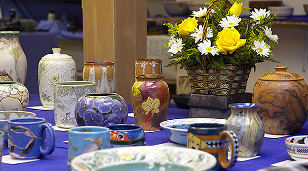 This the main table of where Nan's pots were displayed. Pots that were auctioned on Saturday morning were put on white pieces of paper with their starting bids. |