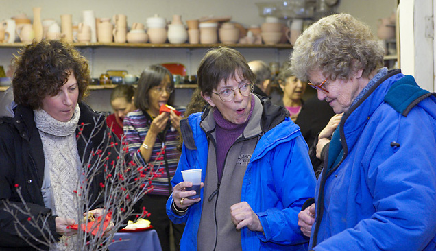 Friday night there was a party with lots of food and drink while people walked around checking out all the pots. |